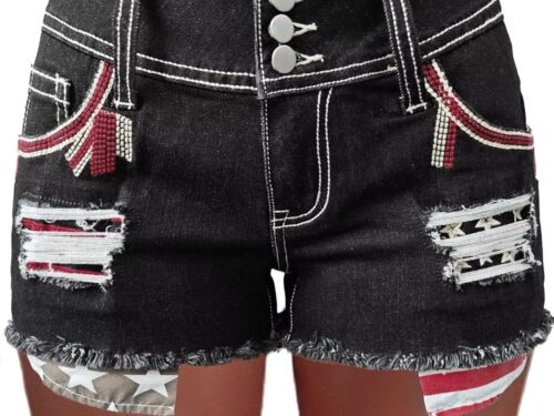Women High Waist American Flag Button Fly Raw Hem Denim Shorts