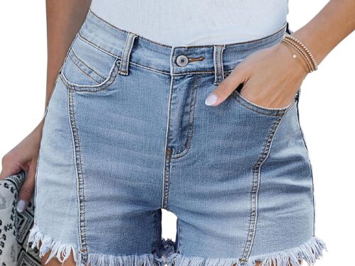 Women Trendy High Waisted Seamed Front Stretchy Denim Shorts Cut Off Frayed Hem Casual Summer