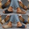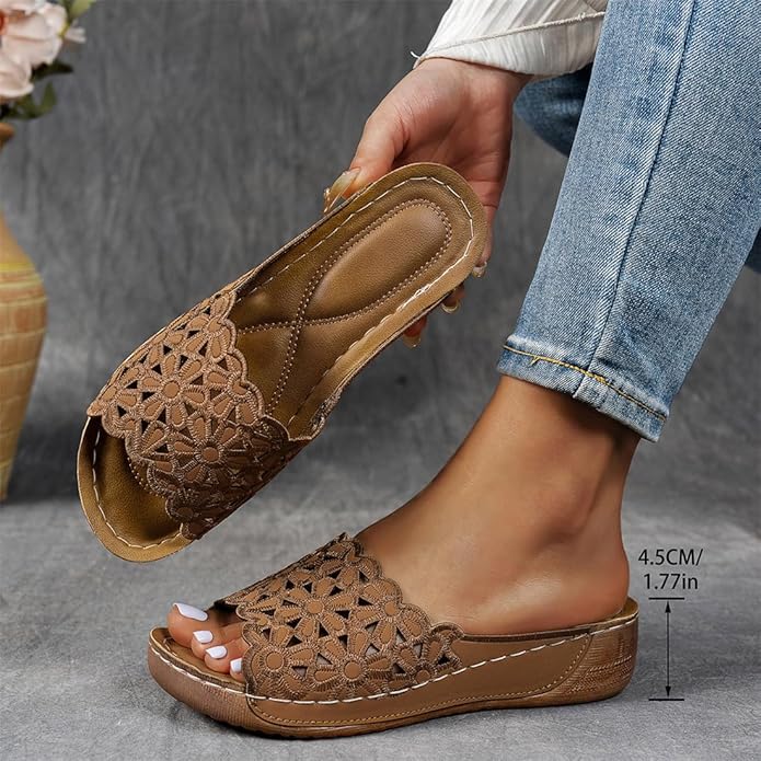 - Lightweight summer mesh slip-on sandals designed with a non-slip wedge and floral accents, offering both style and stability for casual outings.